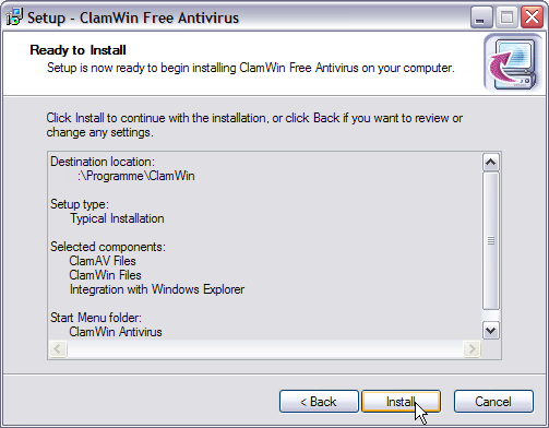 Wenn Sie vor Download Virus Database Files einen Haken setzen, werden im Anschluß auf die Installation auch die aktuellen Virensignaturen heruntergeladen. Sie können diesen Vorgang aber auch jederzeit manuelle anstoßen, was im nächsten Abschnitt beschrieben wird. Klicken Sie auf anschließen auf Next.